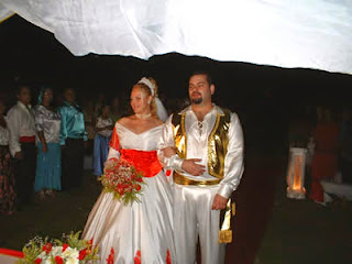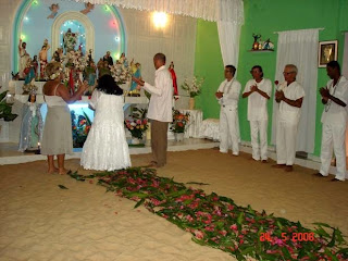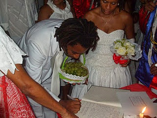 A união é celebrada pela entidade que abençoa as alianças e faz uma preleção sobre a união do casal, que é saudado com pétalas de flores, cravo e canela por onde passam.