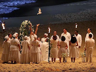 Normalmente os casamentos na Umbanda são presididos pelo Guia ou a Entidade chefe do terreiro, e os noivos, assim como os padrinhos e médiuns estão vestidos de branco.