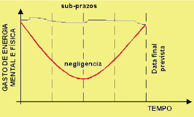2) A linha vermelha representa a nossa negligência, ou seja, o hábito de deixar tudo para o último dia. O que acontece? Temos de correr, realizamos um trabalho qualitativamente inferior e ainda adquirimos o estresse.